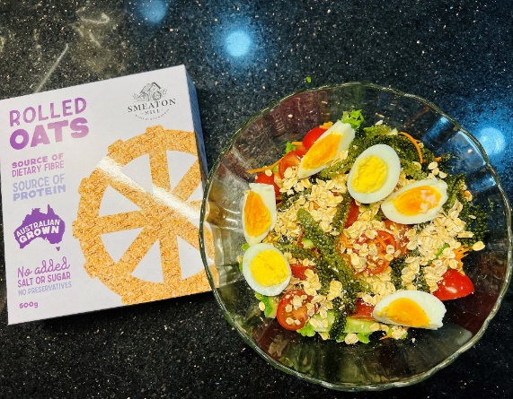 Nguyên liệu: 50gr yến mạch nguyên hạt, rong nho, rau mầm, xà lách, cà chua, dưa leo, bắp cải tím, trứng luộc, nước sốt mè rang.